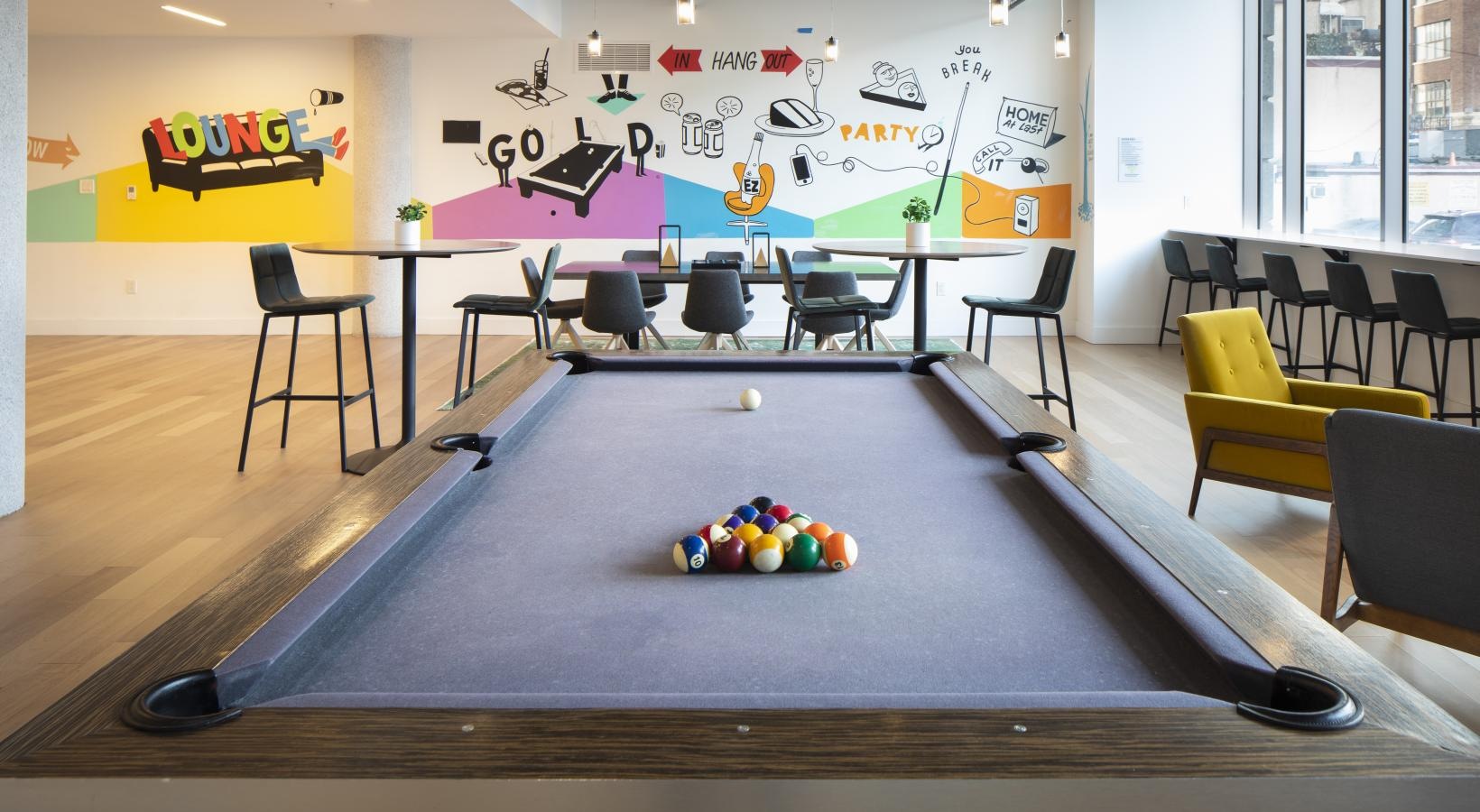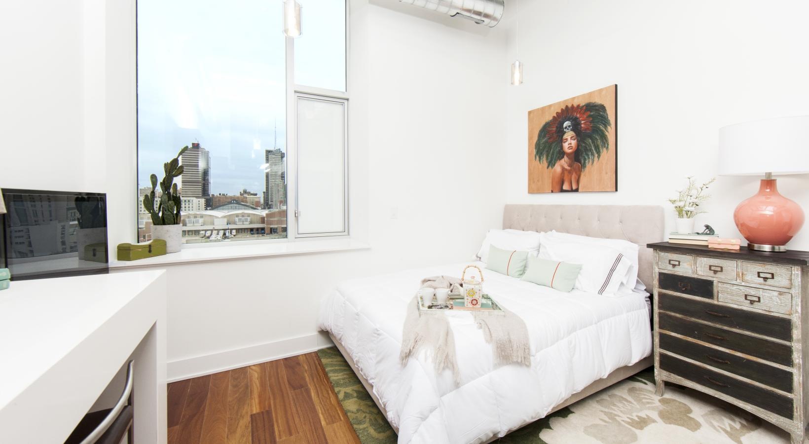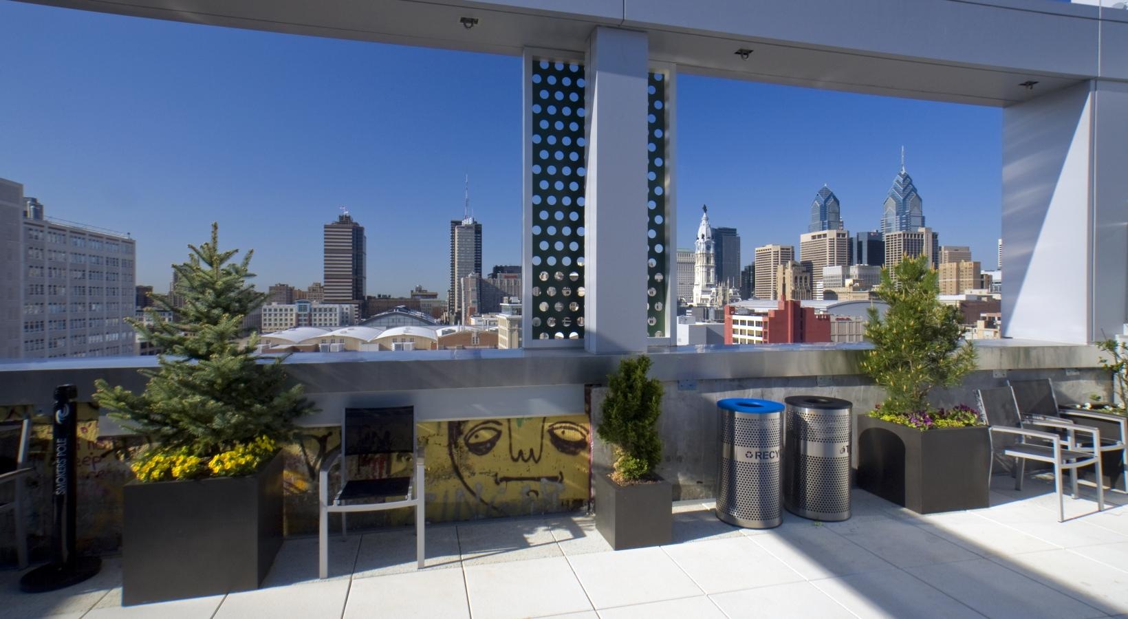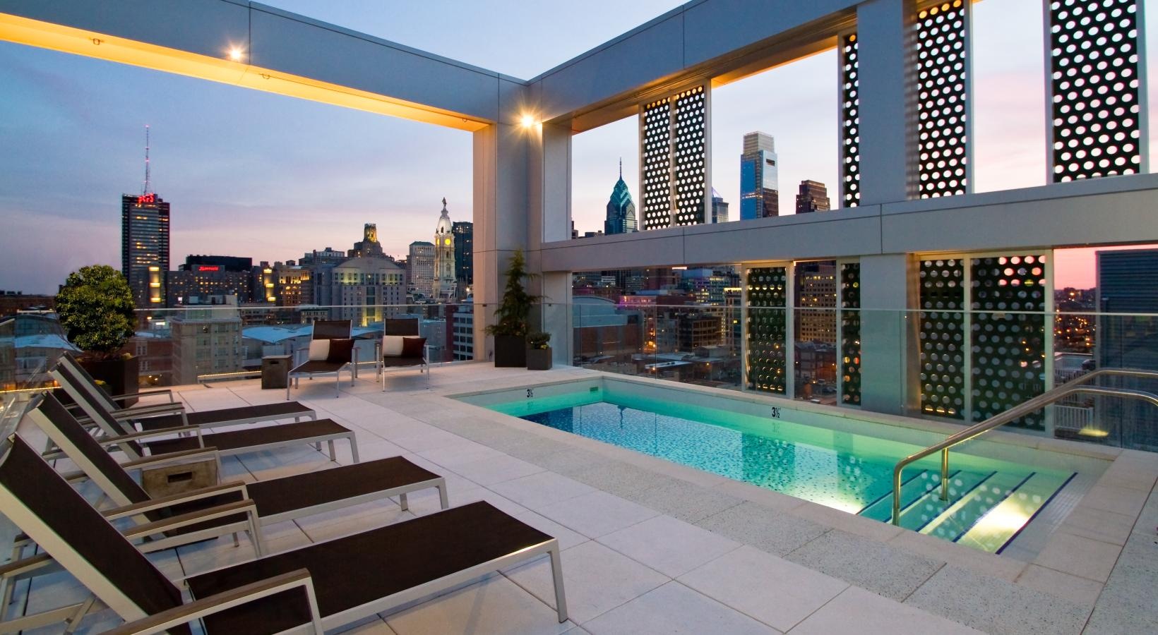 Explore the image gallery of our apartments for rent in Philadelphia, PA at Goldtex, featuring our apartments' thoughtfully-designed layouts with modern interiors, and residential community amenities, such as our rooftop pool with city skyline views and our various residential lounge areas.